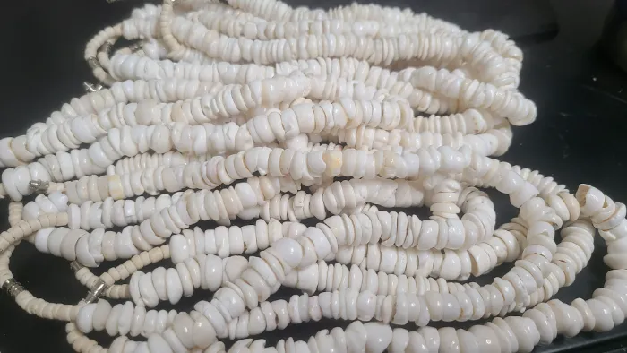 Imitations It is very common for people to call necklaces Puka, even though they might be something else. Check this clip. Lots of times clam and other generic shells are manufactured into beaded necklaces. Workers use pliers to break down a whole shell and manually create the beads before subjecting them to a tumbling process to replicate the smooth edges formed by natural wear-and-tear after a long period of time spent in the ocean surf. The result is a necklace that perhaps only appears as though it has been weathered by nature over many years. A hole is drilled into the middle to string the cord. (The real Puka has a hole that is naturally formed in the ocean...although sometimes a drill is used to help widen or smooth out the holes, in case they are a slightly jagged or rough ) If the "puka" or central hole is perfectly circular and parallel-sided, then the hole was drilled by humans. The non-Puka shell is often bleached to give it a stronger white color. Also, China produces plastic copies of these necklaces. So “buyer beware.” Research and check carefully before you buy these low-priced knock-off versions. The plastic and other non-cone shell options may offer easier production and therefore, cheaper prices, but they will never match the beauty and originality of a genuine puka shell necklace formed naturally in the ocean waves.