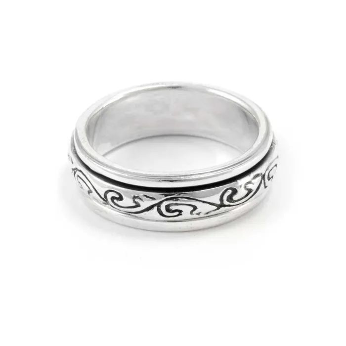 Fidgeting with a piece of jewelry that you are already wearing, is much more practical and sanitary than grabbing for a cheap plastic toy. This anti-stress jewelry can also help you associate feelings of peace and comfort with your ring, which you ALREADY own… and hopefully, love to wear. Many people are soothed by the sense of rubbing their fingers against the engraved texture of a miniature hand-crafted spinning wheel made out of a natural material like silver. The spinner can be seen by some as similar to the Buddhist wheel of life which covers the Non-linear cycle of death and rebirth. Spinning it relaxes the mind and dispels negative emotions similar to the way Buddhist Monks spin their prayer wheel.